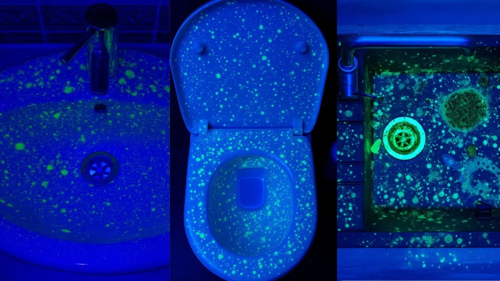 Hon visade före- och efterbilder tagna med specialiserad detektionsutrustning. Ytor som såg skinande rena ut lyste upp som julgranar under bakterieskanning – och avslöjade kolonier av: